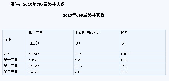 2010年GDP現(xiàn)價(jià)總量為401513億元,比初步核實(shí)數(shù)增加了311億元;按不變價(jià)格計(jì)算,比上年增長10.4%,與初步核實(shí)數(shù)相同(詳見附件)。