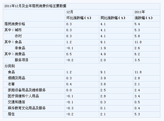 2011年12月份,全國(guó)居民消費(fèi)價(jià)格總水平同比上漲4.1%。其中,城市上漲4.1%,農(nóng)村上漲4.1%;食品價(jià)格上漲9.1%,非食品價(jià)格上漲1.9%;消費(fèi)品價(jià)格上漲4.9%,服務(wù)項(xiàng)目?jī)r(jià)格上漲2.0%。全國(guó)居民消費(fèi)價(jià)格總水平環(huán)比上漲0.3%。其中,城市上漲0.3%,農(nóng)村上漲0.3%;食品價(jià)格上漲1.2%,非食品價(jià)格下降0.1%;消費(fèi)品價(jià)格上漲0.5%,服務(wù)項(xiàng)目?jī)r(jià)格下降0.2%。2011年,全國(guó)居民消費(fèi)價(jià)格總水平比上年上漲5.4%。