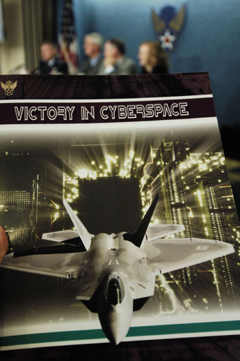 在美國(guó)首都華盛頓國(guó)家記者俱樂(lè)部舉行的一次新聞發(fā)布會(huì)上,美國(guó)空軍網(wǎng)絡(luò)戰(zhàn)爭(zhēng)司令部的高級(jí)官員向新聞界闡述了網(wǎng)絡(luò)戰(zhàn)爭(zhēng)的理念。這是在現(xiàn)場(chǎng)拍攝的美國(guó)空軍網(wǎng)絡(luò)戰(zhàn)爭(zhēng)司令部的宣傳冊(cè)。記者