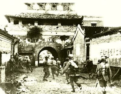 新華社記者黎楓拍攝的1947年9月我軍解放霸州縣的場(chǎng)景,畫面中的建筑為當(dāng)時(shí)霸縣的制高點(diǎn)鼓樓。