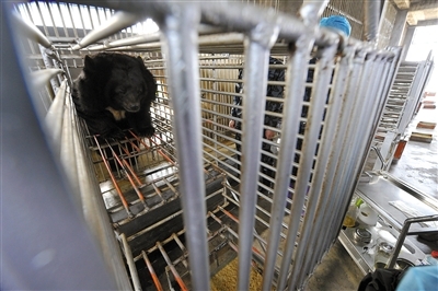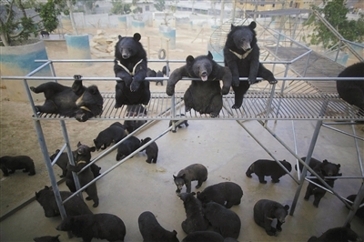 歸真堂的黑熊散養(yǎng)區(qū)內(nèi)有五、六十只幼年黑熊在活動(dòng)。散養(yǎng)區(qū)后方,是一排排的熊舍。據(jù)了解,這個(gè)生物園共有六百多頭黑熊。黑熊要三歲以上才可引膽汁,眼前這幾十頭還屬幼熊,尚未取過(guò)膽汁。