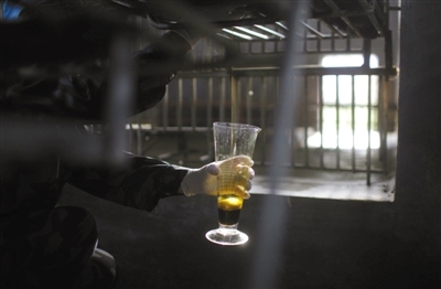 緊挨散養(yǎng)區(qū)的,是熊膽引流區(qū)。前來(lái)參觀的媒體記者按照歸真堂發(fā)放的參觀證編號(hào),在引流區(qū)前排隊(duì)等候叫號(hào)進(jìn)入熊膽汁引流室,引流室內(nèi)分布著兩排熊舍和兩排引膽用的鐵籠。熊進(jìn)入引流籠后,自動(dòng)趴著,低頭舔舐?lián)胶土伺D痰娘暳。從體態(tài)、意識(shí)、行動(dòng)看沒(méi)有異樣。章軻