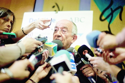 據(jù)外媒報道,西班牙央行行長奧德內茲(Miguel Angel Fernandez Ordonez)周二(4月10日)在馬德里的一場會議上說:“如果西班牙經(jīng)濟比預期更為惡化,繼續(xù)給銀行增加資本金將是必要的”。他表示,西班牙經(jīng)濟不可能在短期內強勁反彈。相關報道稱,西班牙經(jīng)濟今年正在走入衰退,政府預計經(jīng)濟將萎縮1.7%。 圖為奧德內茲在接受媒體采訪。