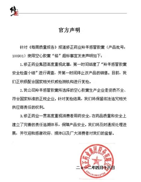 1.修正藥業(yè)集團(tuán)高度重視此事,第一時(shí)間組建了“羚羊感冒膠囊安全檢查小組”進(jìn)行調(diào)查,并第一時(shí)間停止該產(chǎn)品的銷(xiāo)售。目前,我們正積極配合國(guó)家相關(guān)權(quán)威檢測(cè)機(jī)構(gòu)進(jìn)行復(fù)檢。 2.我公司羚羊感冒膠囊所選擇的空心膠囊生產(chǎn)企業(yè)是資質(zhì)齊全、符合國(guó)家標(biāo)準(zhǔn)的正規(guī)企業(yè)。針對(duì)復(fù)檢結(jié)果,我們將保留依法追究相關(guān)供應(yīng)商責(zé)任的權(quán)利。 3.修正藥業(yè)一貫高度重視消費(fèi)者用藥安全,在藥品質(zhì)量和安全上建立了完善的責(zé)任追溯體系,保障產(chǎn)品安全。我們將及時(shí)通報(bào)處理進(jìn)展,并歡迎和感謝政府、媒體以及廣大消費(fèi)者對(duì)我們的監(jiān)督。 以下為修正藥業(yè)官方聲明截圖