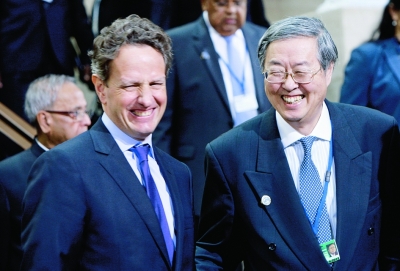 二十國集團(G20)財長和央行行長20日在華盛頓重點就國際貨幣基金組織(IMF)增資與改革問題進行了討論。中方在發(fā)言中指出,相信歐洲完全有智慧、有能力妥善應對歐債危機,中國對歐元區(qū)的經(jīng)濟金融穩(wěn)定有信心。對于國際社會在共識的基礎上向IMF增加資源,中國不會缺席。IMF增加資源應主要以份額為基礎。希望IMF敦促各國盡快完成2010年份額改革方案的審批程序,確保在今年10月IMF年會前按時完成。圖為,21日,在美國華盛頓,中國人民銀行行長周小川(右)與美國財長蓋特納在等待合影前交談。