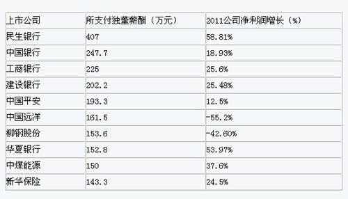 2011年,2283家上市公司共支付的獨(dú)董薪酬共4.50億元,其中最慷慨的上市公司為民生銀行,2011年獨(dú)董薪酬支出金額高達(dá)407萬(wàn)元,排名前十的上市公司依次是,中國(guó)銀行(237萬(wàn))、工商銀行(225萬(wàn))、建設(shè)銀行(202萬(wàn)),中國(guó)平安(193萬(wàn)元),中國(guó)遠(yuǎn)洋(161萬(wàn)元)、柳鋼股份(153萬(wàn)元)、華夏銀行(152萬(wàn)元),中煤能源(150萬(wàn)元)、新華保險(xiǎn)(143萬(wàn)元)。