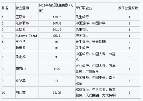 2011年“外快”最高獨(dú)董,非民生銀行的王聯(lián)章莫屬,以126.5萬元的高薪穩(wěn)居榜單第一。5144名獨(dú)董中,最掙錢的TOP十,分別是王聯(lián)章、范徐麗泰、王松奇、Alberto