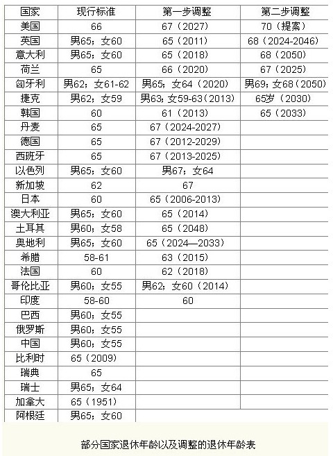 美國各州的退休年齡五花八門,全美國平均的退休年齡為65歲,但一般均可在62歲提前退休,。2000開始美國將逐步延長退休年齡,到2027年美國平均退休年齡將延長至67歲,而平均退休年齡延長到70歲的計(jì)劃也被提上日程,而在2012年6月,美國國際集團(tuán)CEO羅伯特-本默切更是提出退休年齡應(yīng)提高到80歲。