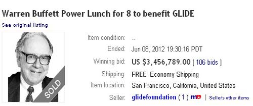 一年一度的巴菲特慈善午餐拍賣的競拍價(jià)格最終以3,456,789美元落錘。