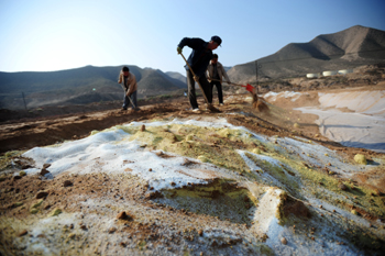 圖為甘肅某地,工人把摻雜了化學(xué)試劑的受污染土壤埋入改良工程淋洗池中。新華社記者