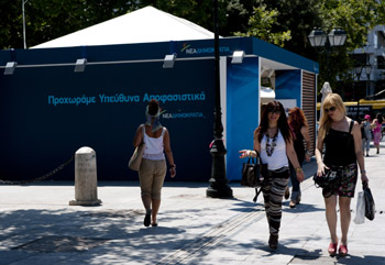 希臘首都雅典,民眾走過新民主黨選舉工作站。希臘將于6月17日舉行一個(gè)半月之內(nèi)的第二次議會(huì)選舉。這次選舉將在很大程度上決定希臘在歐元區(qū)的去留,乃至關(guān)系到整個(gè)歐元區(qū)的前途。記者
