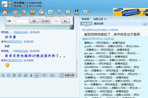 對(duì)用戶來說,比起余額被盜用更為可怕的是個(gè)人信息全無保障。在這個(gè)QQ群里,有人發(fā)布了幾百位京東用戶的用戶名、密碼、余額、積分信息,以及該賬戶是否手機(jī)驗(yàn)證、是否郵箱驗(yàn)證,所有信息一應(yīng)俱全。記者隨機(jī)登錄后發(fā)現(xiàn),這些信息基本都是真實(shí)的。據(jù)提供這一信息的網(wǎng)友說,他是在另一個(gè)群里得到的這些信息,是通過京東后臺(tái)直接提取的。