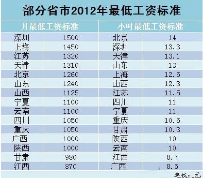 從2012年1月1日起到6月21日,北京、四川、江西、陜西、深圳、山東、上海、天津、廣西、寧夏、甘肅、山西、云南、重慶、江蘇這15個省市先后調整了最低工資標準。