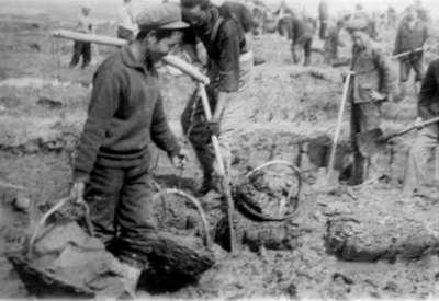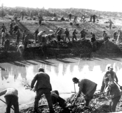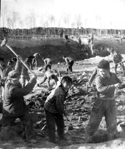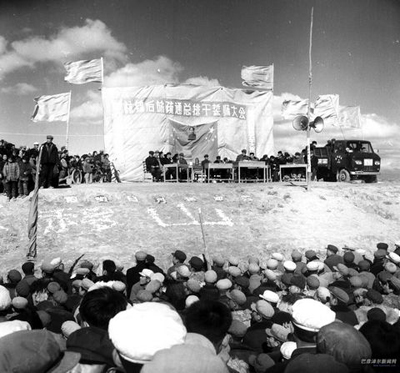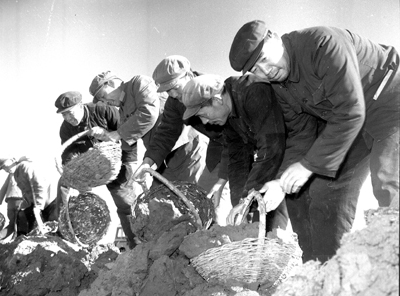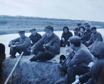 原巴彥淖爾盟盟委書記李貴(左三)在總排干開挖現(xiàn)場(chǎng)與干部群眾座談。