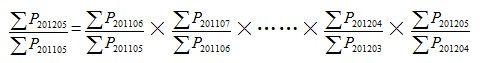 3、同比價(jià)格指數(shù)的計(jì)算方法。由于部分城市用以計(jì)算同比價(jià)格指數(shù)的基期網(wǎng)簽數(shù)據(jù)缺失,故不能計(jì)算2012年10月前各月與網(wǎng)簽數(shù)據(jù)同一口徑的同比價(jià)格指數(shù)。為保持同比價(jià)格指數(shù)計(jì)算和發(fā)布的連續(xù)性和穩(wěn)定性,滿足有關(guān)方面的需要,國家統(tǒng)計(jì)局采用有關(guān)房價(jià)統(tǒng)計(jì)數(shù)據(jù)和按網(wǎng)簽數(shù)據(jù)計(jì)算的房價(jià)數(shù)據(jù),根據(jù)同比指數(shù)和環(huán)比指數(shù)之間的數(shù)學(xué)關(guān)系,對(duì)5月份同比價(jià)格指數(shù)的計(jì)算進(jìn)行了技術(shù)處理:將2011年6—12月的環(huán)比數(shù)據(jù)連乘再乘以今年1—5月的環(huán)比數(shù)據(jù)生成本月同比價(jià)格指數(shù)。以此類推可計(jì)算其他月份的同比價(jià)格指數(shù)。計(jì)算公式表示為: