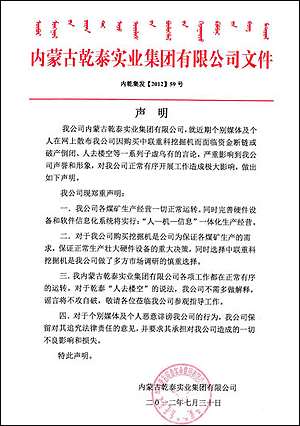聲明同時(shí)表示,“乾泰公司各煤礦生產(chǎn)經(jīng)營(yíng)一切正常運(yùn)轉(zhuǎn)。同時(shí)完善硬件設(shè)備和軟件信息化系統(tǒng)將實(shí)現(xiàn):‘人——機(jī)——信息’一體化生產(chǎn)經(jīng)營(yíng);對(duì)于我公司購(gòu)買(mǎi)挖掘機(jī)是保證各煤礦生產(chǎn)的需求,保證正常生產(chǎn)壯大硬件設(shè)備的重大決策,同時(shí)選擇在中聯(lián)重科挖掘機(jī)是我公司做了多方市場(chǎng)調(diào)研的慎重選擇。我內(nèi)蒙古乾泰實(shí)業(yè)集團(tuán)有限公司各項(xiàng)工作都在正常有序的運(yùn)轉(zhuǎn),對(duì)于乾泰‘人去樓空’的說(shuō)法,我公司不需多做解釋,謠言將不攻自破,敬請(qǐng)各位蒞臨我公司參觀指導(dǎo)工作!
