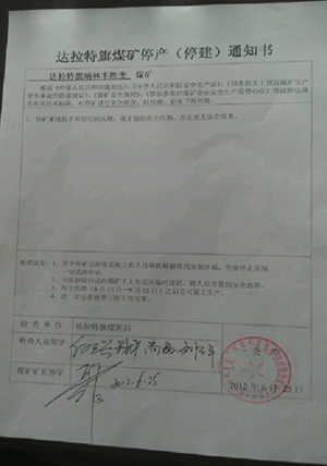 另一份則為內(nèi)蒙古達(dá)拉特旗煤炭局針對(duì)達(dá)拉特旗納林豐勝奎煤礦的停產(chǎn)通知書(shū),通知書(shū)指出,“豐勝奎煤礦采區(qū)位于河道行洪區(qū)域,現(xiàn)正值防汛主汛期,存在重大安全隱患,責(zé)令你礦立即將采場(chǎng)工作人員和機(jī)械撤離至安全區(qū)域,全面停止采場(chǎng)一切采剝作業(yè);立即拆除河道內(nèi)煤礦工人生活區(qū)臨時(shí)建筑,將人員安置到安全地帶;待主汛期(6月15日—9月15日)之后方可復(fù)工生產(chǎn);進(jìn)一步完善雨季三防工作方案。