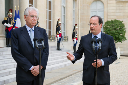 法國總統(tǒng)弗朗索瓦·奧朗德與意大利總理馬里奧·蒙蒂7月31日在巴黎會(huì)晤后發(fā)表聯(lián)合聲明說,法意兩國在根本上與歐元區(qū)完整性緊密相連,決心采取一切措施捍衛(wèi)歐元區(qū)。