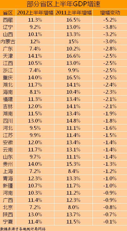 截至8月1日,除甘肅和黑龍江省之外,全國已有29個省(自治區(qū)、直轄市)份公布了2012年上半年GDP(國內(nèi)生產(chǎn)總值)增速。與2011年上半年相比,29個省份的GDP增速均出現(xiàn)了放緩。其中,西藏增幅下降最大,降幅達(dá)5.2個百分點(diǎn)。