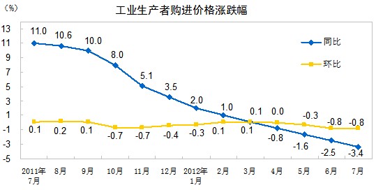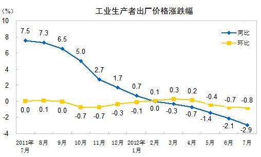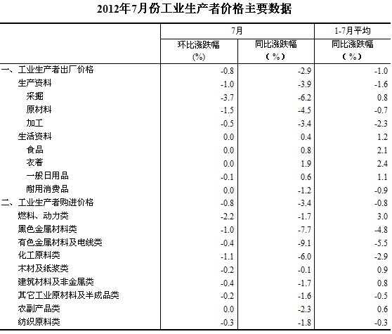 2012年7月份,全國工業(yè)生產(chǎn)者出廠價格同比下降2.9%,環(huán)比下降0.8%。工業(yè)生產(chǎn)者購進價格同比下降3.4%,環(huán)比下降0.8%。1—7月平均,工業(yè)生產(chǎn)者出廠價格同比下降1.0%,工業(yè)生產(chǎn)者購進價格同比下降0.8%。