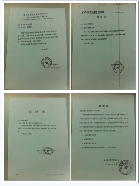 根據(jù)目前獲得的供應(yīng)商聯(lián)絡(luò)函,停止供貨的雷士供應(yīng)商包括惠州一品五金電器塑膠制品廠(chǎng)、重慶雷寶商貿(mào)有限公司、金煜包裝材料廠(chǎng)以及世達(dá)印刷有限公司。
