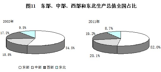 黨的十六大以來,黨中央、國務(wù)院陸續(xù)部署了繼續(xù)推進(jìn)西部大開發(fā)戰(zhàn)略、實(shí)施東北地區(qū)等老工業(yè)基地振興戰(zhàn)略和促進(jìn)中部地區(qū)崛起規(guī)劃和鼓勵(lì)東部地區(qū)率先發(fā)展政策,系統(tǒng)制定了促進(jìn)邊疆民族地區(qū)經(jīng)濟(jì)社會加快發(fā)展的政策措施,密集出臺了一批經(jīng)濟(jì)區(qū)、經(jīng)濟(jì)帶發(fā)展規(guī)劃,實(shí)施了全國主體功能區(qū)規(guī)劃和促進(jìn)產(chǎn)業(yè)轉(zhuǎn)移的政策措施。在各項(xiàng)政策支持和各地區(qū)努力下,西部地區(qū)基礎(chǔ)設(shè)施建設(shè)取得突破性進(jìn)展。青藏鐵路、西氣東輸、西電東送、支線機(jī)場、干線公路相繼建設(shè)完工;中部地區(qū)承東啟西的區(qū)位優(yōu)勢進(jìn)一步凸顯,生態(tài)經(jīng)濟(jì)區(qū)、城市群和綜合交通樞紐建設(shè)快速發(fā)展;東北地區(qū)資源型城市轉(zhuǎn)型以及國有企業(yè)、國有林區(qū)墾區(qū)等多項(xiàng)改革扎實(shí)推進(jìn)。各地區(qū)發(fā)展?jié)摿Σ粩噌尫,區(qū)域比較優(yōu)勢得到充分發(fā)揮,呈現(xiàn)出協(xié)調(diào)發(fā)展的趨勢。2011年,中部地區(qū)、西部地區(qū)地區(qū)生產(chǎn)總值占全國的比重分別為20.1%、19.2%,分別比2002年提高1.3、2.0個(gè)百分點(diǎn)。2011年,中部地區(qū)、西部地區(qū)、東北地區(qū)全社會固定資產(chǎn)投資占全國的比重分別為23.2%、23.5%和10.7%,分別比2002年提高5.5、3.2和2.4個(gè)百分點(diǎn)。