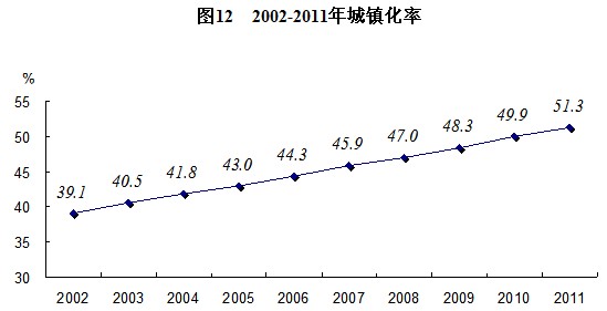 城鎮(zhèn)化是擴(kuò)大內(nèi)需的戰(zhàn)略重點(diǎn),也是社會轉(zhuǎn)型發(fā)展的重要標(biāo)志。黨的十六大以來,按照統(tǒng)籌規(guī)劃、合理布局、完善功能、以大帶小的原則,一批城市發(fā)展總體規(guī)劃制定實(shí)施,城市體系和功能不斷完善,人口和經(jīng)濟(jì)的集聚能力不斷增強(qiáng)。2011年,城鎮(zhèn)總?cè)丝诒?002年增長了37.6%,鄉(xiāng)村總?cè)丝跍p少了16.1%。2011年,我國城鎮(zhèn)化率首次突破50%,達(dá)到51.3%,比2002年提高12.2個(gè)百分點(diǎn),我國城鄉(xiāng)結(jié)構(gòu)發(fā)生歷史性變化。城鎮(zhèn)吸納就業(yè)的能力不斷增強(qiáng)。2011年,城鎮(zhèn)就業(yè)人員35914萬人,比2002年增加10755萬人,年均增加1195萬人。城鎮(zhèn)就業(yè)人員占全國就業(yè)總量的比重為47.0%,比2002年提高12.7個(gè)百分點(diǎn)。城鎮(zhèn)就業(yè)崗位的快速增加,帶動了鄉(xiāng)村勞動力不斷向城鎮(zhèn)轉(zhuǎn)移。