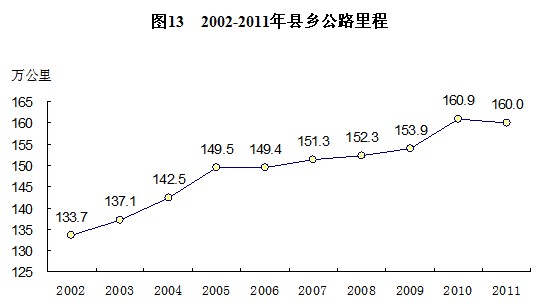 農(nóng)村面貌加快改善,城鄉(xiāng)經(jīng)濟(jì)社會發(fā)展一體化新格局逐步形成。黨的十六大以來的十年,是我國農(nóng)業(yè)農(nóng)村發(fā)生歷史性巨變、農(nóng)民得實(shí)惠最多的時(shí)期之一,是“三農(nóng)”發(fā)展的又一個(gè)“黃金期”。自黨中央作出社會主義新農(nóng)村建設(shè)部署以來,黨和政府始終堅(jiān)持把發(fā)展農(nóng)村公共事業(yè)作為縮小城鄉(xiāng)差距的重要抓手,持續(xù)加強(qiáng)農(nóng)村基礎(chǔ)設(shè)施建設(shè)和公共服務(wù),農(nóng)村水、電、燃?xì)、通訊等基礎(chǔ)設(shè)施建設(shè)進(jìn)一步加強(qiáng),農(nóng)村生產(chǎn)生活環(huán)境大大改善。2011年全國縣鄉(xiāng)公路里程達(dá)160萬公里,比2002年增加26萬公里,東部和中部“村村通”公路目標(biāo)已經(jīng)實(shí)現(xiàn),西部98%的行政村通了公路,全面完成國務(wù)院確定的“十一五”農(nóng)村公路建設(shè)目標(biāo)任務(wù)。通過實(shí)施飲水工程,解決了3.26億農(nóng)村人口的飲水安全問題。