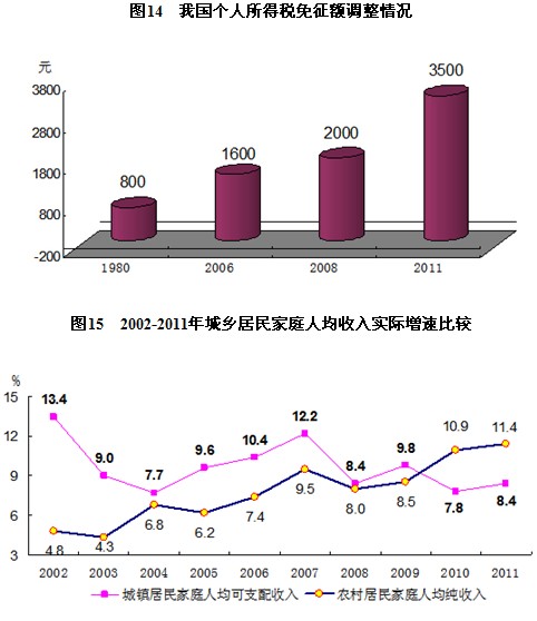黨的十六大以來,黨中央堅(jiān)持民生優(yōu)先,把保障和改善民生作為一切工作的出發(fā)點(diǎn)和落腳點(diǎn),逐步推進(jìn)分配領(lǐng)域的各項(xiàng)改革,通過大力支持?jǐn)U大就業(yè),提高勞動工資最低標(biāo)準(zhǔn),提高退休工資,不斷提高對低收入群體的轉(zhuǎn)移支付水平和覆蓋面,三次調(diào)高個(gè)人所得稅起征點(diǎn)等政策措施,千方百計(jì)拓寬增收渠道,提高居民收入水平。特別是把增加農(nóng)民收入作為農(nóng)村工作的中心任務(wù),促進(jìn)增產(chǎn)增收、優(yōu)質(zhì)增收、提價(jià)增收、務(wù)工增收、補(bǔ)貼增收,農(nóng)民收入實(shí)現(xiàn)了連續(xù)多年較快增長。2011年,城鎮(zhèn)居民人均可支配收入21810元,比2002年增長1.8倍,扣除價(jià)格因素,年均實(shí)際增長9.2%;農(nóng)村居民人均純收入6977元,比2002年增長1.8倍,扣除價(jià)格因素,年均實(shí)際增長8.1%。城鄉(xiāng)居民收入年均增速超過1979—2011年7.4%的年均增速,是歷史上增長最快的時(shí)期之一。收入持續(xù)增長,吃穿住用等均有了很大改善,日子越過越好,主要耐用消費(fèi)品擁有量大幅增長。2011年底,農(nóng)村居民家庭平均每百戶擁有電冰箱61.5臺,增長3.1倍;空調(diào)機(jī)22.6臺,增長8.9倍;擁有移動電話179.7部,增長12.1倍。