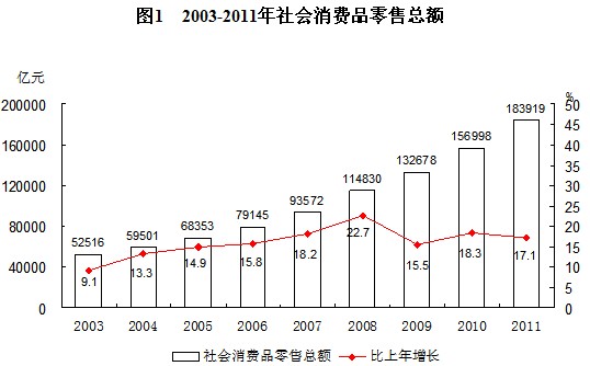消費(fèi)需求穩(wěn)定增長,消費(fèi)結(jié)構(gòu)進(jìn)一步升級。在消費(fèi)方面,通過提高居民收入水平,加快社會保障制度建設(shè),積極實(shí)施家電、汽車下鄉(xiāng)等鼓勵(lì)消費(fèi)政策,扎實(shí)推進(jìn)萬村千鄉(xiāng)市場工程,努力釋放農(nóng)村消費(fèi)潛力,并大力規(guī)范市場秩序,改善消費(fèi)環(huán)境,居民消費(fèi)能力和消費(fèi)預(yù)期進(jìn)一步改善,市場銷售持續(xù)較快增長。2011年社會消費(fèi)品零售總額達(dá)183919億元,比2002年增長2.8倍,年均增長達(dá)16.1%。居民消費(fèi)從生存型向發(fā)展型轉(zhuǎn)變。2011年,城鎮(zhèn)居民家庭恩格爾系數(shù)為36.3%,比2002年降低了1.4個(gè)百分點(diǎn)。農(nóng)村居民家庭恩格爾系數(shù)為40.4%,比2002年降低了5.8個(gè)百分點(diǎn)。以汽車和旅游為例,2011年底,城鎮(zhèn)居民家庭平均每百戶擁有家用汽車18.6輛,比2002年底增加了17.7輛;2002至2011年,國內(nèi)旅游人數(shù)從2002年的8.8億人次增加到2011年的26.4億人次。
