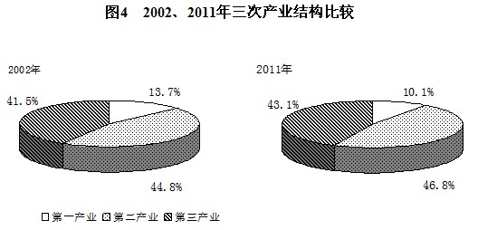 黨的十六大以來,黨中央、國務(wù)院按照科學(xué)發(fā)展觀的要求,圍繞發(fā)展現(xiàn)代農(nóng)業(yè)、走新型工業(yè)化道路和促進(jìn)服務(wù)業(yè)快速發(fā)展的目標(biāo),大力推進(jìn)結(jié)構(gòu)調(diào)整,三次產(chǎn)業(yè)趨向協(xié)同發(fā)展。2003-2011年,第一產(chǎn)業(yè)年均增長4.6%,第二產(chǎn)業(yè)年均增長11.9%,第三產(chǎn)業(yè)年均增長11.1%,均保持較快發(fā)展態(tài)勢。經(jīng)濟(jì)增長由主要依靠工業(yè)帶動向三次產(chǎn)業(yè)協(xié)同帶動轉(zhuǎn)變。從三次產(chǎn)業(yè)結(jié)構(gòu)看,第一產(chǎn)業(yè)增加值占國內(nèi)生產(chǎn)總值比重明顯下降,從2002年的13.7%下降到2011年的10.1%,下降了3.6個(gè)百分點(diǎn);第二產(chǎn)業(yè)增加值占國內(nèi)生產(chǎn)總值比重從2002年的44.8%提高到2011年的46.8%,提高了2.0個(gè)百分點(diǎn);第三產(chǎn)業(yè)增加值占國內(nèi)生產(chǎn)總值的比重從2002年的41.5%提高到2011年的43.1%,提高1.6個(gè)百分點(diǎn)。