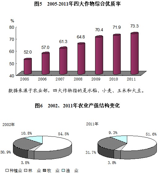 農(nóng)業(yè)生產(chǎn)穩(wěn)步發(fā)展,優(yōu)質(zhì)農(nóng)產(chǎn)品比重明顯上升,農(nóng)業(yè)基礎(chǔ)地位不斷穩(wěn)固。黨的十六大以來,黨中央、國務(wù)院確立了把解決好“三農(nóng)”問題作為全黨工作重中之重的戰(zhàn)略思想,制定了“工業(yè)反哺農(nóng)業(yè)、城市支持農(nóng)村”和“多予、少取、放活”的指導(dǎo)方針,部署了加快發(fā)展現(xiàn)代農(nóng)業(yè)、建設(shè)社會主義新農(nóng)村的戰(zhàn)略任務(wù),取消了農(nóng)業(yè)稅,實(shí)行了對農(nóng)、畜、林及草原等的直接補(bǔ)貼、良種補(bǔ)貼、農(nóng)機(jī)具購置補(bǔ)貼和農(nóng)資綜合補(bǔ)貼,全面放開糧食購銷,推進(jìn)集體林權(quán)制度改革,堅(jiān)持不懈地推進(jìn)農(nóng)業(yè)科技進(jìn)步,加快推進(jìn)現(xiàn)代農(nóng)業(yè)建設(shè),農(nóng)業(yè)生產(chǎn)穩(wěn)步發(fā)展,農(nóng)業(yè)基礎(chǔ)地位不斷穩(wěn)固。糧食生產(chǎn)扭轉(zhuǎn)了一度下滑局面,實(shí)現(xiàn)了“八連增”。2011年,糧食總產(chǎn)量達(dá)到57121萬噸,比2002年增長25.0%,年均增長2.5%,連續(xù)5年穩(wěn)定在5億噸以上,其他主要農(nóng)產(chǎn)品也穩(wěn)中有增。與此同時(shí),農(nóng)業(yè)結(jié)構(gòu)不斷優(yōu)化,優(yōu)質(zhì)農(nóng)產(chǎn)品比重明顯上升,規(guī);N養(yǎng)、區(qū)域化布局、標(biāo)準(zhǔn)化生產(chǎn)加速推進(jìn)。2011年水稻、小麥、玉米優(yōu)質(zhì)化率分別達(dá)到81.0%、74.3%和64.6%,分別比2005年提高16.3、25.5和27.7個(gè)百分點(diǎn)。大宗農(nóng)產(chǎn)品生產(chǎn)繼續(xù)向優(yōu)勢產(chǎn)區(qū)集中,13個(gè)糧食主產(chǎn)省對糧食增產(chǎn)的貢獻(xiàn)達(dá)到90%以上。農(nóng)業(yè)物質(zhì)技術(shù)裝備水平穩(wěn)步提高,農(nóng)田有效灌溉面積擴(kuò)大了7300多萬畝,農(nóng)作物耕種收綜合機(jī)械化率提高了18.6個(gè)百分點(diǎn)。2011年農(nóng)業(yè)科技貢獻(xiàn)率達(dá)到53.5%,有力支撐了農(nóng)業(yè)持續(xù)穩(wěn)定發(fā)展。