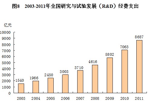 努力提高科技創(chuàng)新對經(jīng)濟(jì)發(fā)展的貢獻(xiàn),逐步擺脫經(jīng)濟(jì)發(fā)展對資源消耗和環(huán)境投入的過度依賴,是落實(shí)科學(xué)發(fā)展觀的重要內(nèi)涵。十六大以來,黨中央、國務(wù)院十分重視推進(jìn)科技創(chuàng)新,大力實(shí)施科技、教育、人才三項(xiàng)中長期發(fā)展規(guī)劃綱要。科技投入持續(xù)增加,科技發(fā)展成果豐碩。2011年,全國研究與試驗(yàn)發(fā)展(R&D)經(jīng)費(fèi)支出8687億元,比2002年增長5.7倍,占國內(nèi)生產(chǎn)總值的比重由1.07%上升到1.84%。2011年,研究與試驗(yàn)發(fā)展人員全時(shí)當(dāng)量[1]288.3萬人年,比2002年增長1.8倍。技術(shù)市場成交額4764億元,比2002年增長4.4倍。重要科學(xué)前沿和戰(zhàn)略必爭領(lǐng)域取得了一批重大創(chuàng)新成果。千萬億次超級計(jì)算機(jī)系統(tǒng)“天河一號”研制成功,百畝超級雜交稻試驗(yàn)田畝產(chǎn)突破900公斤,載人潛水器“蛟龍”號創(chuàng)下了7062米的下潛紀(jì)錄,嫦娥一號、二號探月衛(wèi)星成功發(fā)射,神舟九號載人航天飛行圓滿成功,特別是天宮一號目標(biāo)飛行器與神舟九號飛船順利載人交會對接,標(biāo)志著我國載人航天工程第二步戰(zhàn)略目標(biāo)取得了具有決定性意義的重要進(jìn)展。
