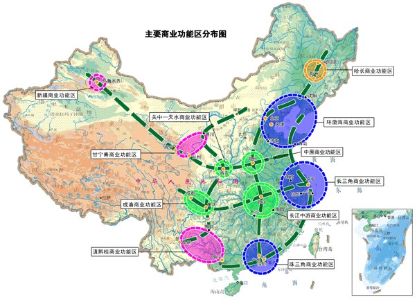 2.發(fā)揮主要商業(yè)功能區(qū)的輻射帶動(dòng)作用。結(jié)合國(guó)家區(qū)域發(fā)展總體戰(zhàn)略和構(gòu)建城市化戰(zhàn)略格局的總體部署,加快形成11個(gè)主要商業(yè)功能區(qū),發(fā)揮其商品集散、價(jià)格形成、消費(fèi)集聚、產(chǎn)業(yè)服務(wù)和輻射帶動(dòng)功能,形成一批國(guó)內(nèi)貿(mào)易的重要增長(zhǎng)極(見(jiàn)主要商業(yè)功能區(qū)分布圖)。推動(dòng)環(huán)渤海、長(zhǎng)三角、珠三角商業(yè)功能區(qū)建設(shè),大力發(fā)展現(xiàn)代服務(wù)業(yè),進(jìn)一步強(qiáng)化貿(mào)易中心地位和消費(fèi)集聚功能。推動(dòng)中原、長(zhǎng)江中游、成渝、關(guān)中—天水商業(yè)功能區(qū)建設(shè),強(qiáng)化商品特別是農(nóng)產(chǎn)品現(xiàn)代物流基地和流通樞紐地位,提升商品集散和消費(fèi)集聚功能。推動(dòng)滇黔桂、甘寧青、新疆商業(yè)功能區(qū)建設(shè),支持特色商品流通、民族貿(mào)易和邊境貿(mào)易發(fā)展,增強(qiáng)商品集散功能和市場(chǎng)保障能力。推動(dòng)哈長(zhǎng)商業(yè)功能區(qū)建設(shè),大力發(fā)展糧食等重要商品流通和專業(yè)服務(wù)行業(yè),增強(qiáng)商品集散功能和為產(chǎn)業(yè)服務(wù)的能力。加強(qiáng)規(guī)劃銜接、資源共享和市場(chǎng)開(kāi)放,實(shí)現(xiàn)主要商業(yè)功能區(qū)內(nèi)部一體化發(fā)展和功能區(qū)之間協(xié)調(diào)聯(lián)動(dòng)發(fā)展,初步形成全國(guó)骨干流通網(wǎng)絡(luò)。