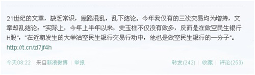 今日,某媒體以《史玉柱沽空民生銀行再調(diào)查港交所詳解淡倉(cāng)規(guī)則》為題,發(fā)表了一篇內(nèi)容涉及質(zhì)疑史玉柱做空民生銀行H股的報(bào)道。對(duì)此,史玉柱連發(fā)三條微博,對(duì)報(bào)道做出回應(yīng),稱今年以來(lái)僅有三次交易,均為增持。