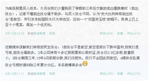 史玉柱連發(fā)三條微博回應(yīng)媒體報(bào)道其做空民生銀行
