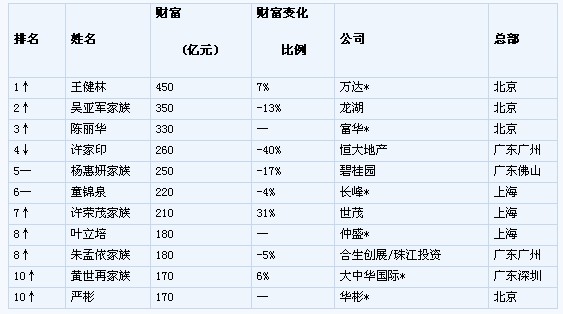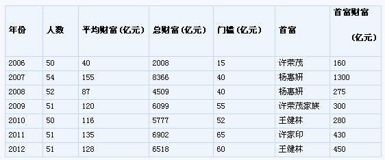 前十名總財富2770億元,平均財富252億元,2011年前十名總財富2885億元,平均財富289億元。