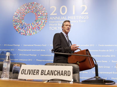 10月9日,國際貨幣基金組織(IMF)首席經濟學家奧利維耶·布朗夏爾在日本東京宣布最新版《世界經濟展望報告》新聞簡報。