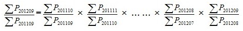 3、同比價格指數(shù)的計算方法。由于部分城市用以計算同比價格指數(shù)的基期網(wǎng)簽數(shù)據(jù)缺失,故不能計算2012年10月前各月與網(wǎng)簽數(shù)據(jù)同一口徑的同比價格指數(shù)。為保持同比價格指數(shù)計算和發(fā)布的連續(xù)性和穩(wěn)定性,滿足有關(guān)方面的需要,國家統(tǒng)計局采用有關(guān)房價統(tǒng)計數(shù)據(jù)和按網(wǎng)簽數(shù)據(jù)計算的房價數(shù)據(jù),根據(jù)同比指數(shù)和環(huán)比指數(shù)之間的數(shù)學(xué)關(guān)系,對9月份同比價格指數(shù)的計算進行了技術(shù)處理:將2011年10—12月的環(huán)比數(shù)據(jù)連乘再乘以今年1—9月的環(huán)比數(shù)據(jù)生成本月同比價格指數(shù)。以此類推可計算其他月份的同比價格指數(shù)。計算公式表示為: