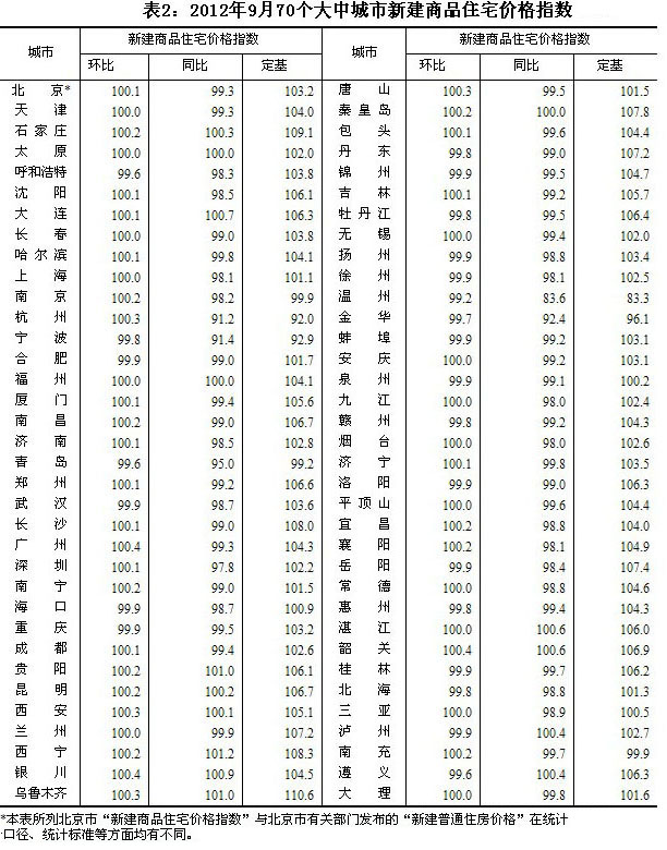 2、現(xiàn)行《住宅銷售價格統(tǒng)計調(diào)查方案》自2011年1月起開始實施,2011年10月70個大中城市全部報送了網(wǎng)簽數(shù)據(jù)。由于各個城市報送網(wǎng)簽數(shù)據(jù)的初始時間不同步,因此2012年10月前,部分城市的數(shù)據(jù)與以往歷史數(shù)據(jù)不完全可比。