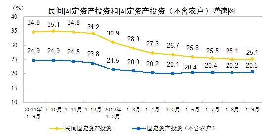 2012年1-9月份,全國民間固定資產(chǎn)投資159412億元,同比名義增長25.1%(扣除價格因素實際增長23.4%),增速與1-8月份持平。民間固定資產(chǎn)投資占固定資產(chǎn)投資的比重為62%,比1-8月份下降0.1個百分點。