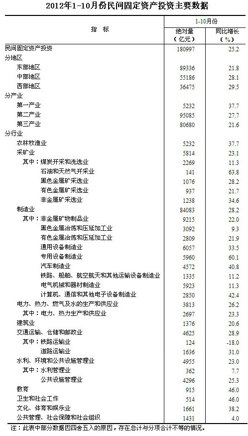 2012年1-10月份,全國民間固定資產(chǎn)投資180997億元,同比名義增長25.2%,增速比1-9月份加快0.1個百分點。民間固定資產(chǎn)投資占固定資產(chǎn)投資的比重為61.9%,比1-9月份下降0.1個百分點。