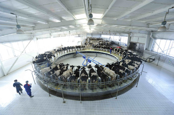 擠奶轉盤——伊利集團引進的帶有電子精確計量和奶牛自動識別系統(tǒng)的國際一流擠奶設施 |