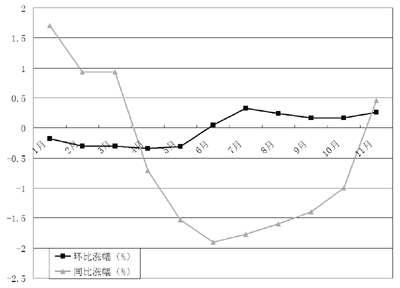 中指院數(shù)據(jù)顯示,11月全國(guó)100個(gè)城市(新建)住宅平均價(jià)格為8791元/平方米,環(huán)比上漲0.26%,漲幅較上月擴(kuò)大0.09個(gè)百分點(diǎn),其中,上漲城市60個(gè),下降城市38個(gè),2個(gè)城市持平。從同比來(lái)看,全國(guó)100個(gè)城市住宅均價(jià)連續(xù)第8個(gè)月下跌,跌幅為0.46%,比上月縮小0.54個(gè)百分點(diǎn)。這是百城住宅平均價(jià)格連續(xù)6個(gè)月環(huán)比上漲,同比跌幅繼續(xù)收窄。