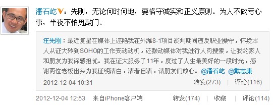 汪先剛的微博原文為:最近復(fù)星在媒體上誣陷我在外灘8-1項(xiàng)目談判期間違反職業(yè)操守,懷疑本人從證大轉(zhuǎn)到SOHO的工作變動(dòng)動(dòng)機(jī),還鼓動(dòng)媒體對(duì)我進(jìn)行人肉搜索,讓我的家人和朋友為我深感擔(dān)憂(yōu)。我在證大服務(wù)了11年,度過(guò)了人生最美好的一段時(shí)光,感謝兩位老板出頭為我證明清白,清者自清,請(qǐng)朋友們放心。