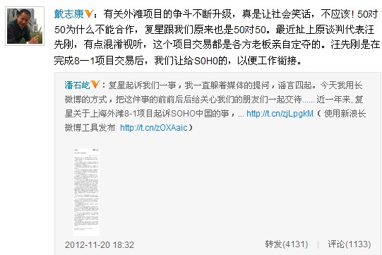 郭廣昌的這番言論引起了媒體的猜測(cè)。今天,潘石屹和戴志康在微博上雙雙否認(rèn)此事。戴志康認(rèn)為復(fù)星是混淆視聽(tīng),他說(shuō),這個(gè)項(xiàng)目交易都是各方老板親自定奪的,而汪先剛是在完成8一1項(xiàng)目交易后,證大才讓給S0H0中國(guó)的,以便工作銜接。