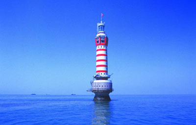 大沽燈塔矗立在大沽口外的海面上,建于1978年,高達(dá)56.45米,是我國目前自行設(shè)計、自行建造的第一座海上最高燈塔。2006年5月22日,國家郵政局發(fā)行了一套特種郵票《現(xiàn)代燈塔》,共四枚,第一枚便是大沽燈塔。燈塔呈圓型,外部飾以白瓷磚和紅白玻璃,紅白相間,具有一種和諧美。塔頂裝有巨型燈具,無論陰、晴、雨、霧,都能發(fā)光導(dǎo)航。尤其是夜間,可以發(fā)出旋轉(zhuǎn)著的強烈興束,射程達(dá)70海里。這座宏偉的12層燈塔,成為塘沽新港的象征。