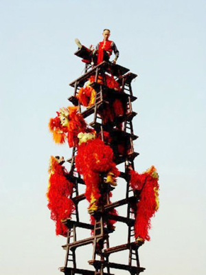 李登山年幼時,就喜歡看熱鬧,陶寺村的“獅子上板凳”更是他的最愛。在師傅李六五的悉心調(diào)教下,李登山16歲就登臺表演,在高高聳立的十米塔臺上騰、挪、跳、躍,動作大起大落,造型優(yōu)美,贏得了滿場喝彩。因表現(xiàn)出眾,師傅把手里的領獅棒傳給了他,成為這一民間絕活的第六代傳人。