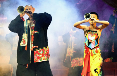 說起吉縣嗩吶的歷史淵源,吉縣文化局局長強朝輝如數(shù)家珍。吉縣壺口嗩吶,屬民間鼓樂,歷史悠久,內(nèi)涵豐富,兼具宮廷韻味和黃土風情。史料顯示,明嘉靖年間,朝廷重臣石寶遭貶來到吉縣,便接手從事鼓樂,對吉縣原來曲牌加以充實改編,吉縣吹打樂便自成體系,距今已有480多年歷史。其內(nèi)容大體可分為兩方面,一是吹奏技巧,二是吹奏曲目。吹奏技巧主要表現(xiàn)是靠苦練而來的古樸演奏方法,如:口鼻無休止循環(huán)換氣;一口吹多個嗩吶;用鼻孔吹奏;模擬動物、鳥類鳴叫;模擬男低音演唱等。