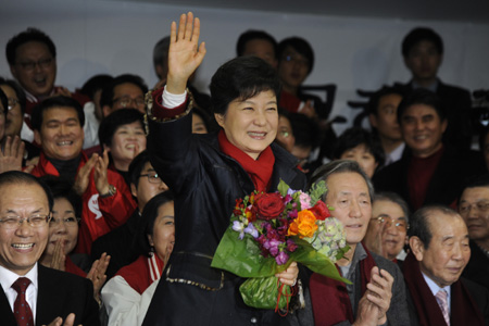圖為樸槿惠在韓國首爾新國家黨黨部向支持者招手示意感謝。
